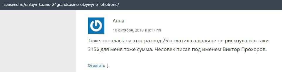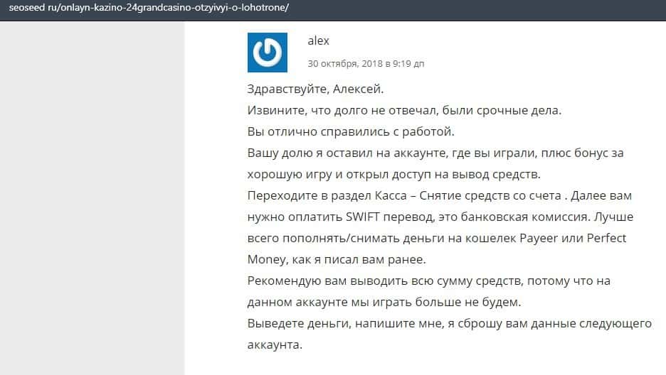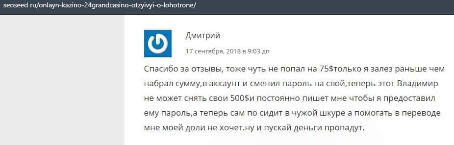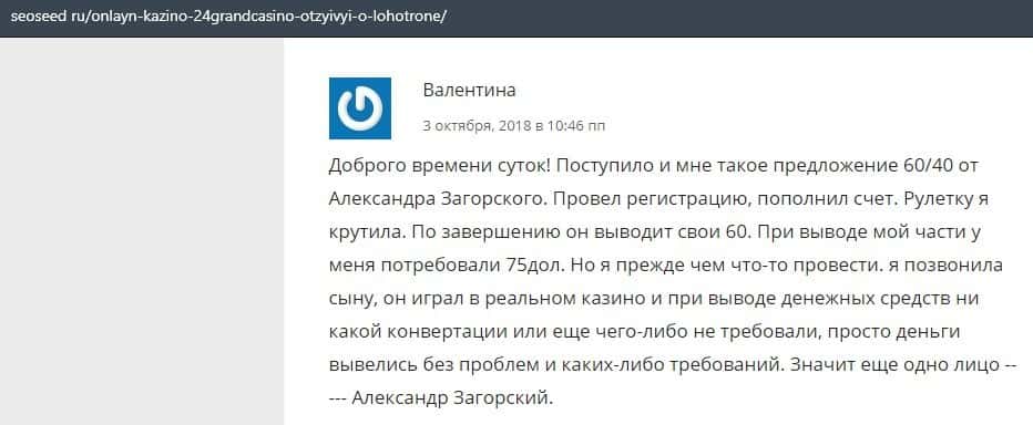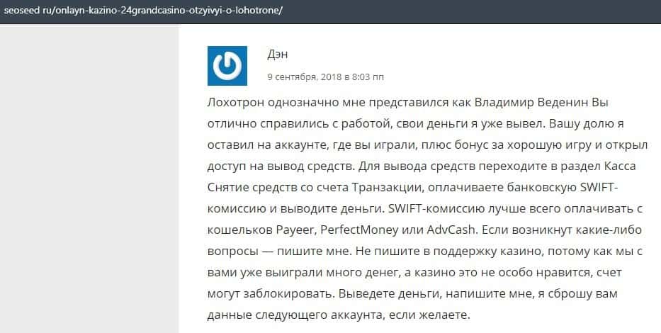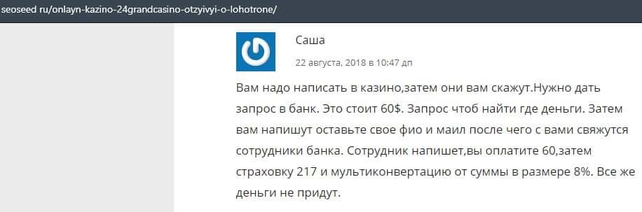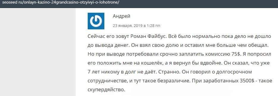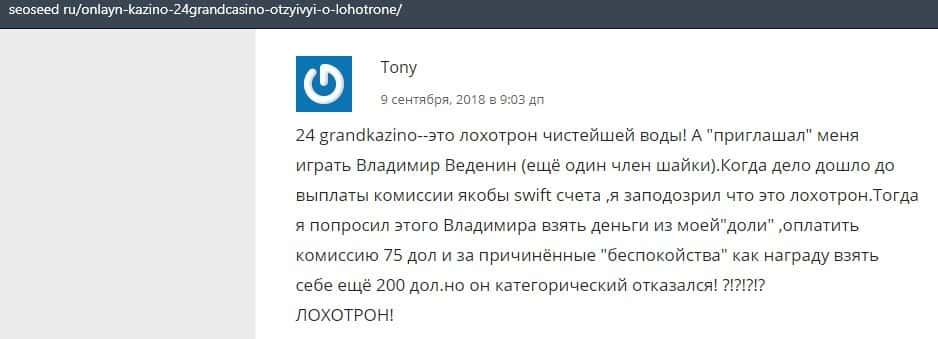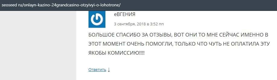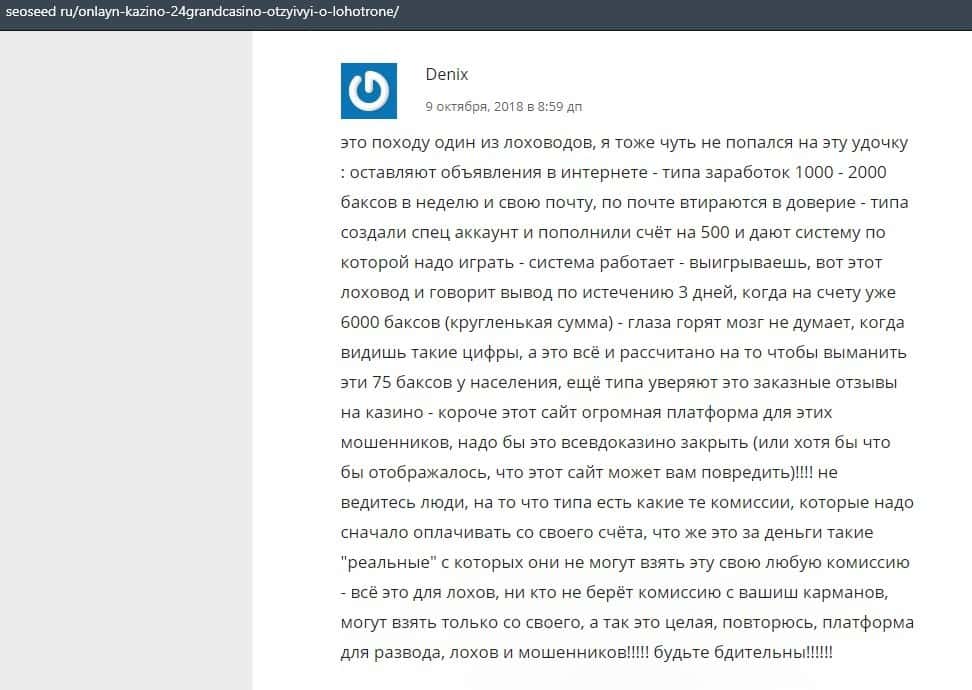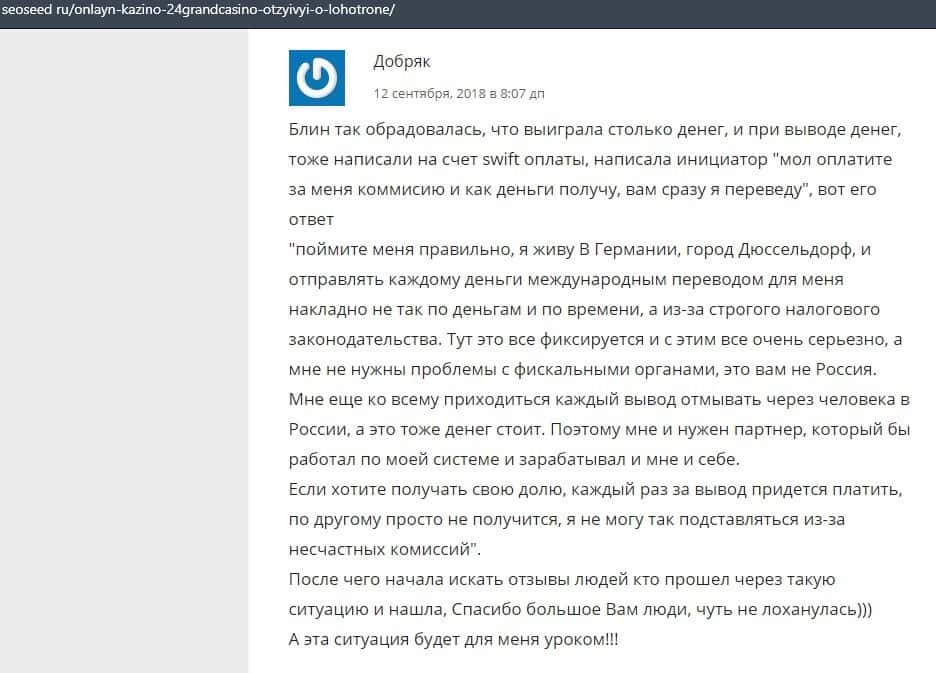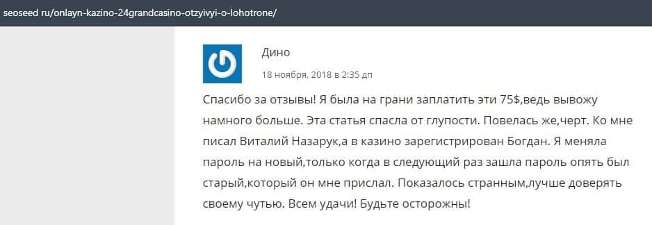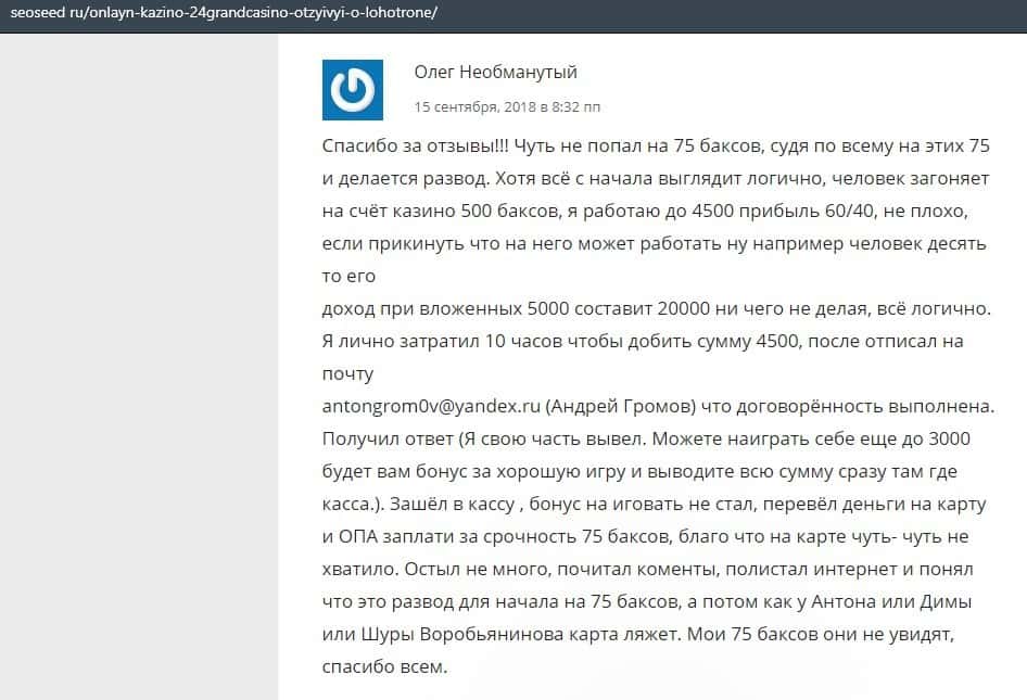 Пользователь сети благодарит людей за отзывы в интернете касательно схем развода конторы 24GrandCasino Net. Он чуть ли не заплатил 75 долларов комиссии, если бы не отзывы.