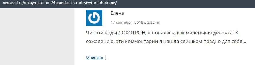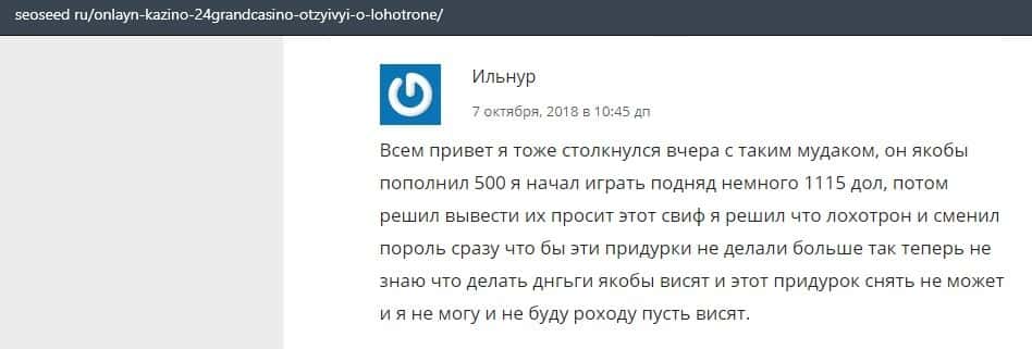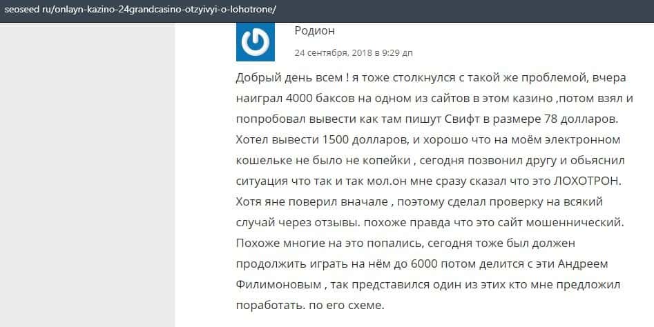 Бывший клиент конторы 24 Гранд Казино попросту указывает на то, что не стоит связываться с этими лохотронщиками, так как это будет стоить вам определенных убытков.