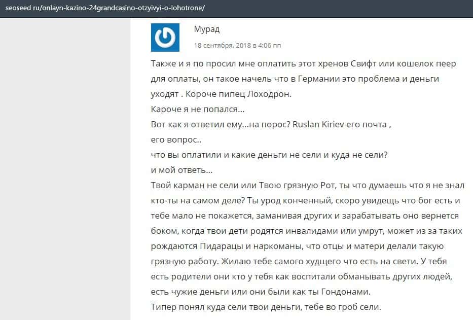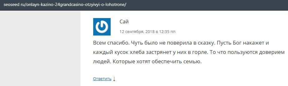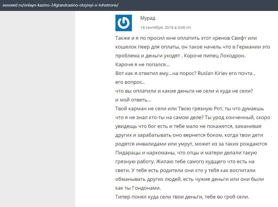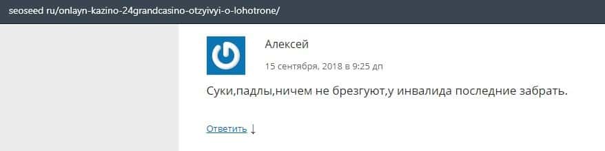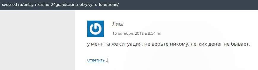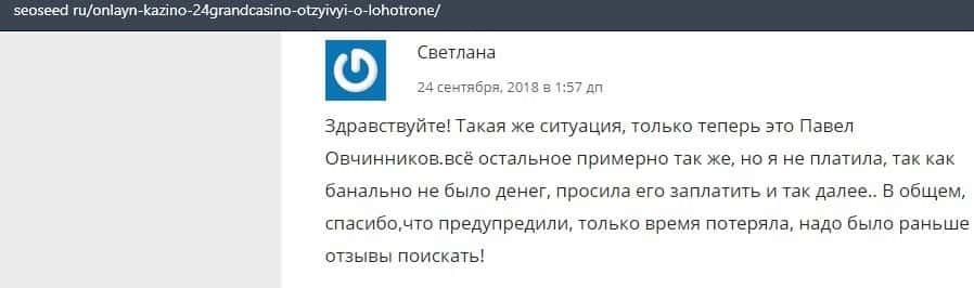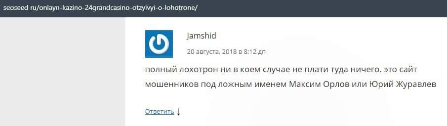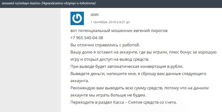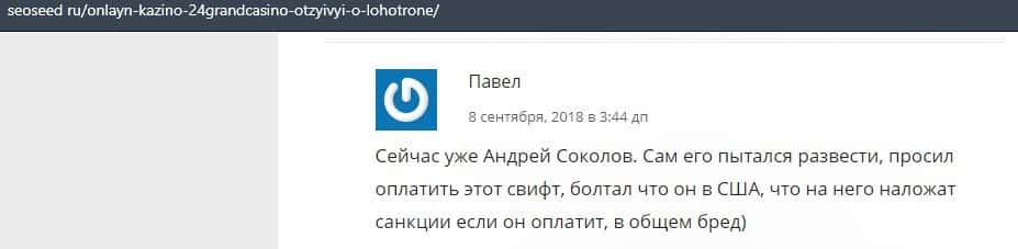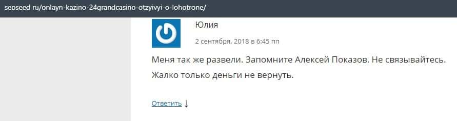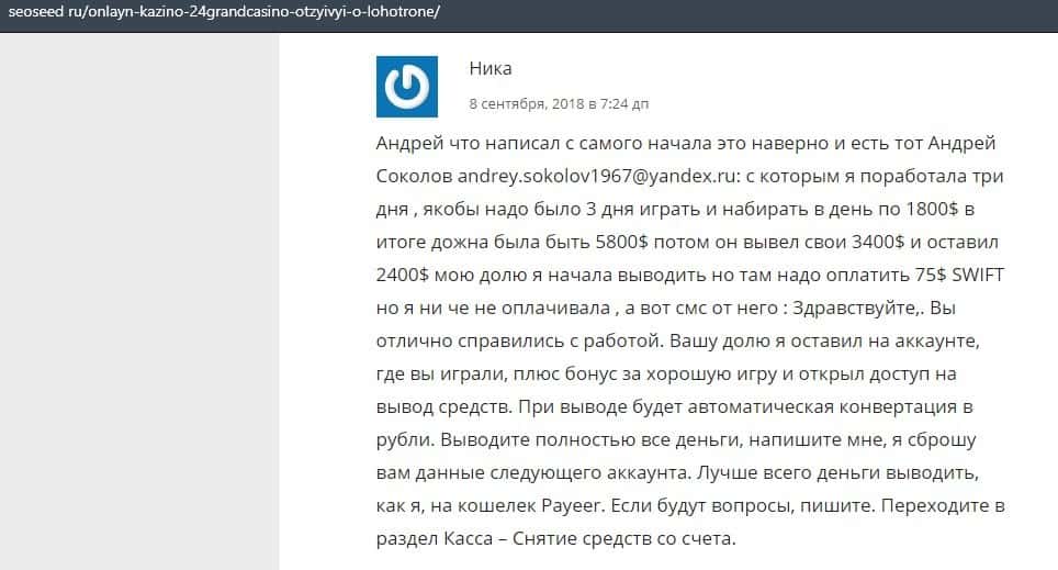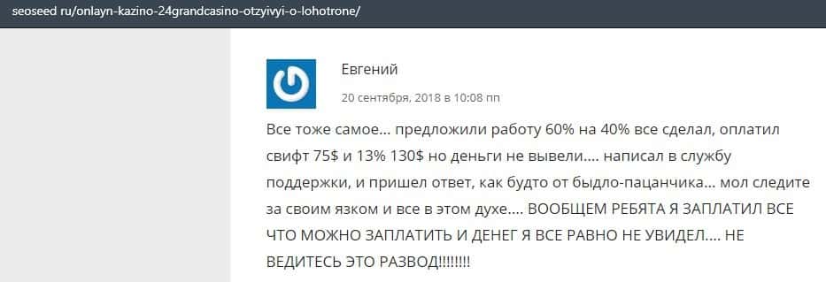 В этом отзыве бывший клиент конторы 24 Гранд Казино указывает на то, что они являются лоховодами, которые постоянно меняют свои фамилии и работают по заезженной схеме.