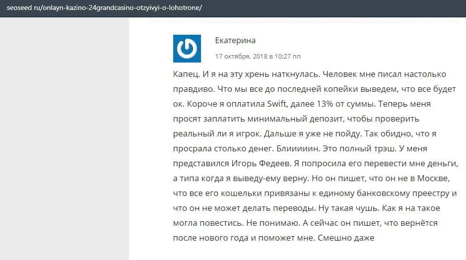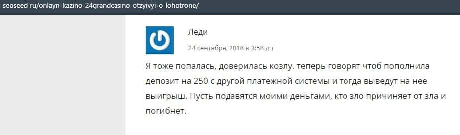 Еще одна пострадавшая указывает на то, что мошенники 24 Гранд Казино вымогают деньги у клиентов налево и направо. Она повелась на этот развод и всех предупреждает об опасности.