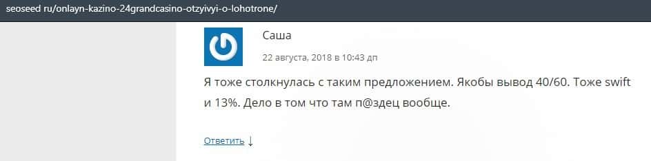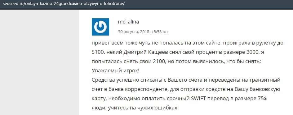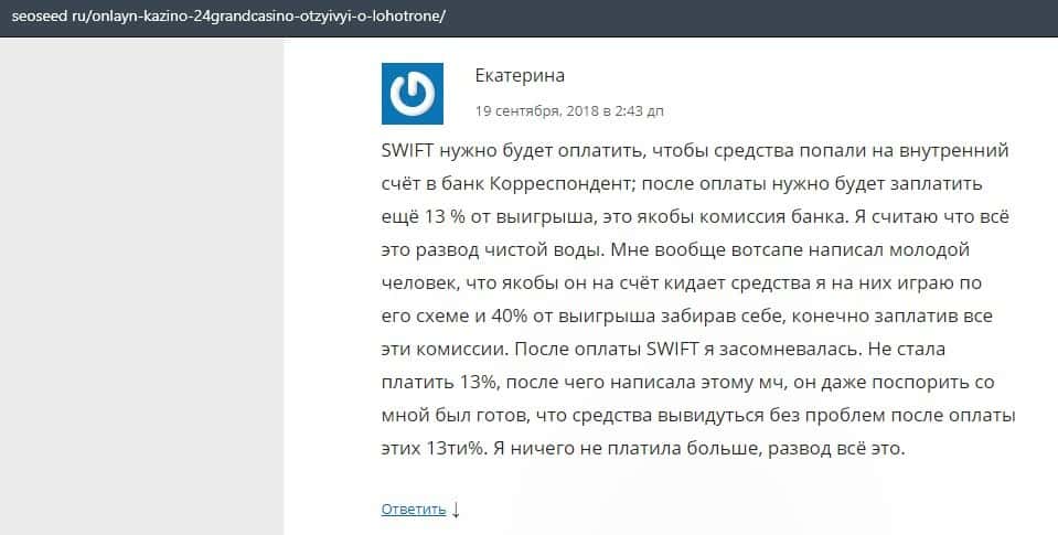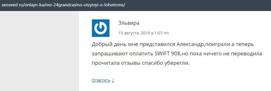 Еще один пострадавший клиент попробовал вывести деньги из конторы 24GrandCasino Net и эти ублюдки заставляли платить какую-то комиссию в размере 78 долларов на SWIFT.