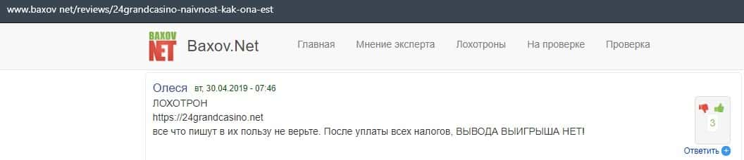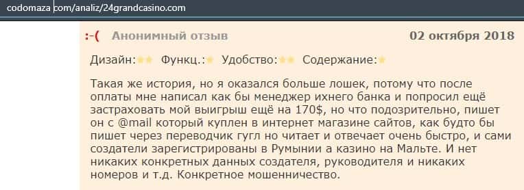 Еще одного пользователя сети уберегли отзывы в сети интернет. Мошенники 24 Гранд Казино запрашивали оплатить 90 долларов, но эта схема уже освещалась в других отзывах.