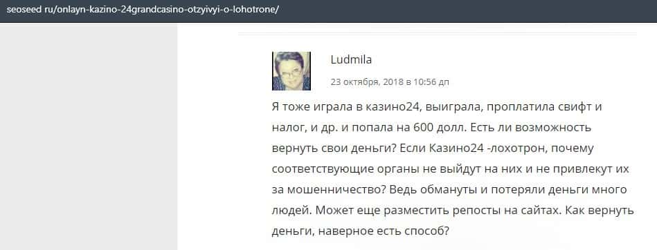 Деньги в конторе 24 Гранд Казино вообще по сути не вернуть, так как мошенники указывают на то, что нужно якобы вложить какую-то сумму и потом якобы все отдадут, но это развод.
