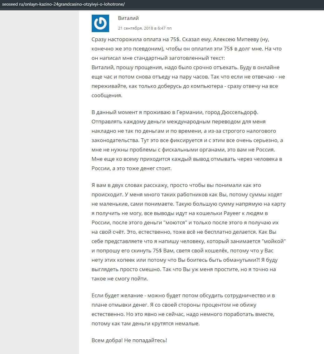 Один пользователь сети хотел обхитрить разводил и пойти против их схемы. Контора 24 Гранд Казино вымогала у него 75 долларов, но он попросил в долг, на чем разговор и кончился.