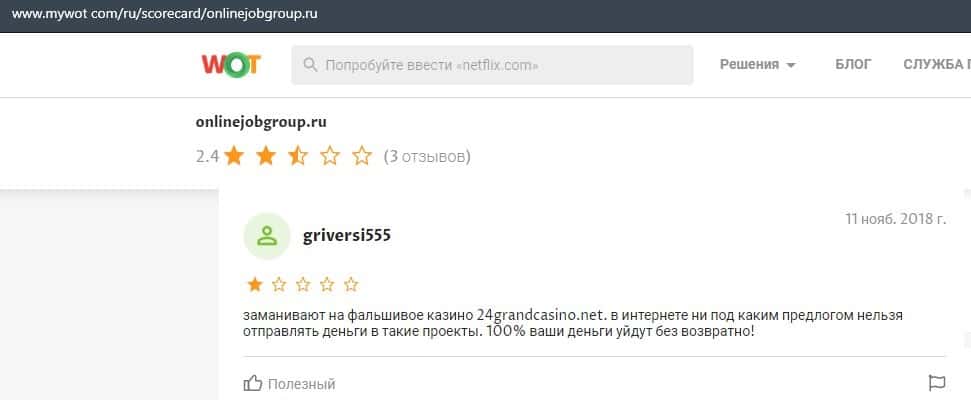 В очередном отзыве указывается, что контора 24GrandCasino Net довольно опасна как для новичков, так и для пользователей с опытом. Так что доверия к ним не может быть никакого.