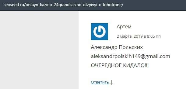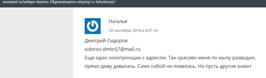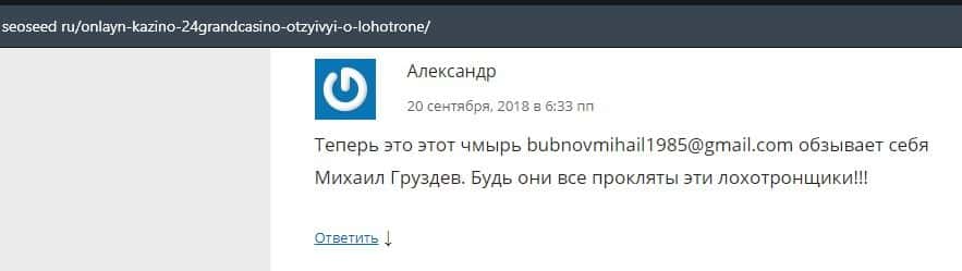 Еще один человек предупреждает, что контора 24 Гранд Казино кидает на деньги. Он даже прикрепил к отзыву адрес электронной почты, через который они присылают свои письма.