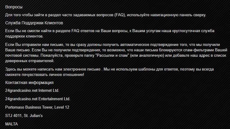 По поводу контактны данных конторы 24 Гранд Казино, то здесь опубликован только их основной адрес. Нет ничего для связи с ними, потому что они требуют зарегистрироваться: