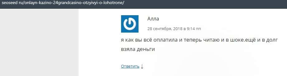 Очередная клиентка рассказала, как она попалась на удочку в шулерской казино 24GrandCasino Net, при чем все вложенные средства она взяла еще и в долг.