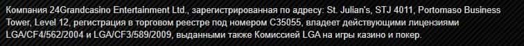 Исходя из официальных данных о конторе 24 Гранд Казино, ею управляет некая компания 24Grandcasino Entertainment Ltd, которая зарегистрирована на острове Мальта.