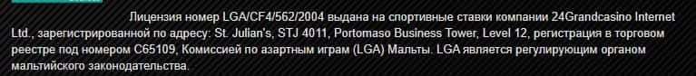 По поводу регулирования деятельности конторы 24 Гранд Казино, здесь они опубликовали несколько лицензий от мальтийского регулятора LGA, но доказательств не предоставили.