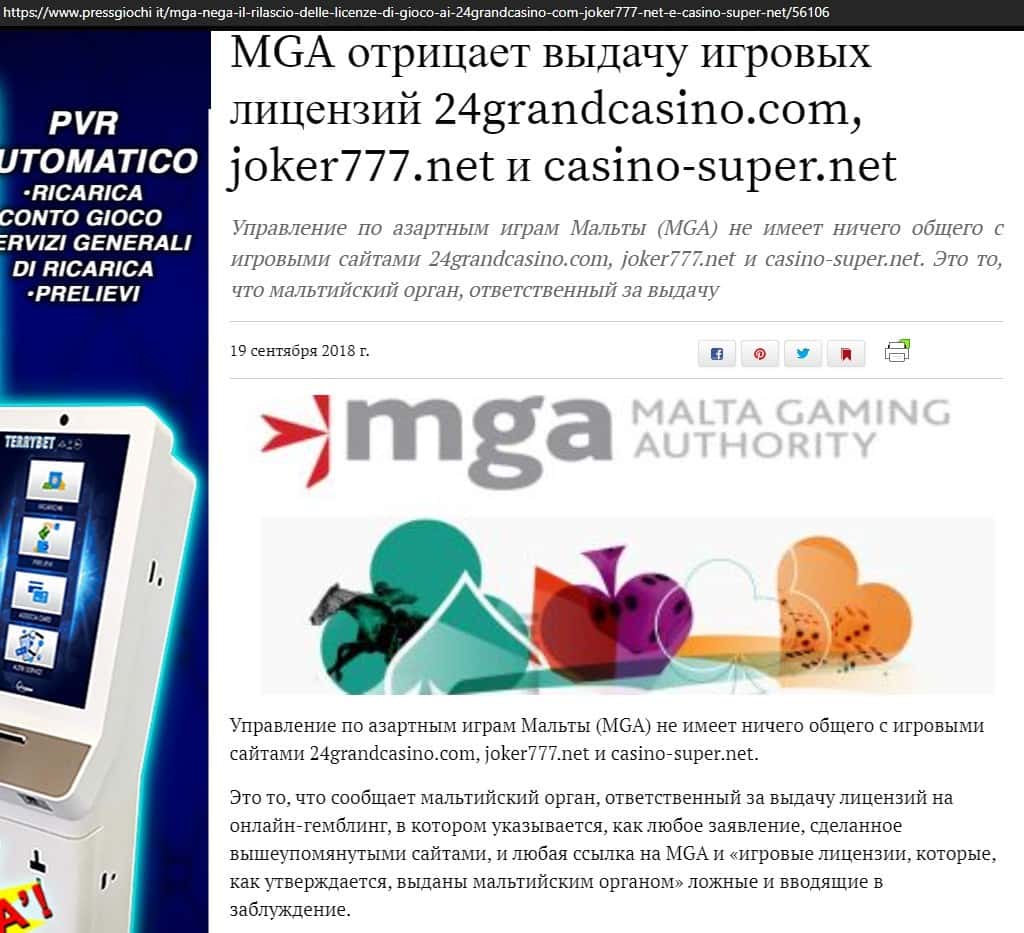 Ниже представлена информация о лохотроне 24 Гранд Казино где указано, что контора 24 Гранд Казино не имеет доказательств, что контора находится под мальтийским регулятором.