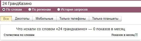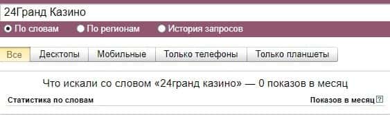 Также нулевые показатели были замечены по бренду "24Гранд Казино" в Яндекс, поэтому контору можно считать не популярной среди русскоязычного населения.