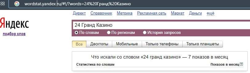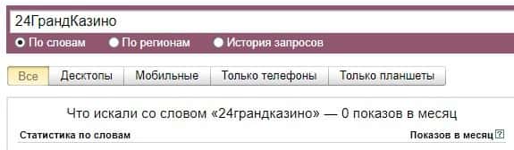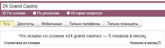 А вот с брендом "24 Grand Casino" ситуация немного другая. Система Яндекс.Вордстат за последний месяц насчитала 5 показов, а это больше чем ноль.