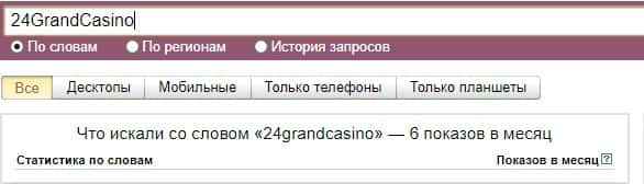 В поисковой системе Яндекс, мошенники под брендом "24 Гранд Казино" не очень популярны и набрали всего-то 7 запросов за месяц.
