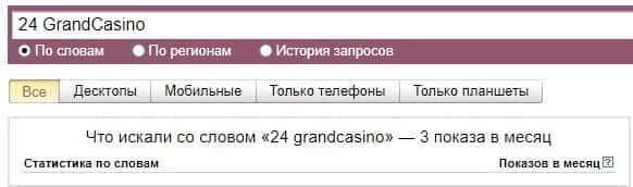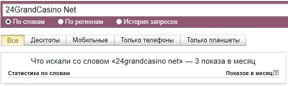 Ну и конечно же бренд "24grandcasino.net" по версии Яндекс.Вордстат набрала 3 показа, что показывает их очень ничтожную популярность в интернете.