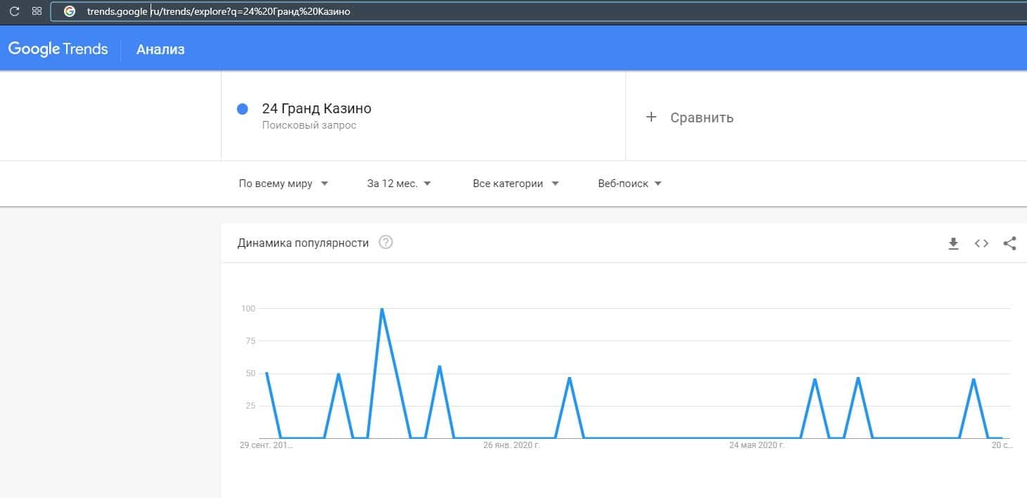 Контора не имела запросов по бренду "24 GrandCasino" и Гугл Трендс не смогла определить источник этих запросов в поиске запросов.