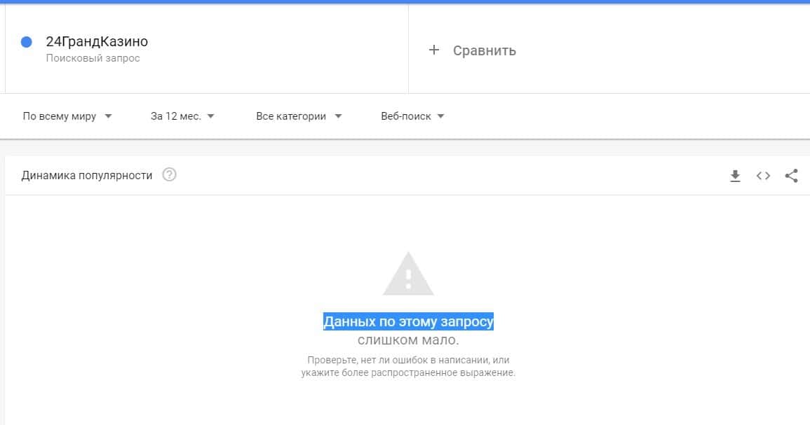 Что касается бренда "24 ГрандКазино", то здесь Гугл Трендс также не смог найти никаких данных, потому что запросов в поиске слишком мало.