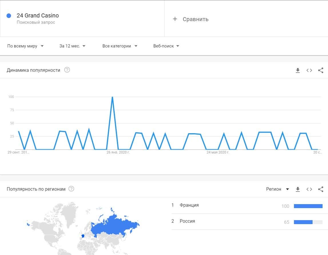 Касательно бренда "24 Grand Casino" по версии Гугл Трендс, системой было найдено мало данных по их запросам, но все же их источник это такие страны как Франция и Россия.