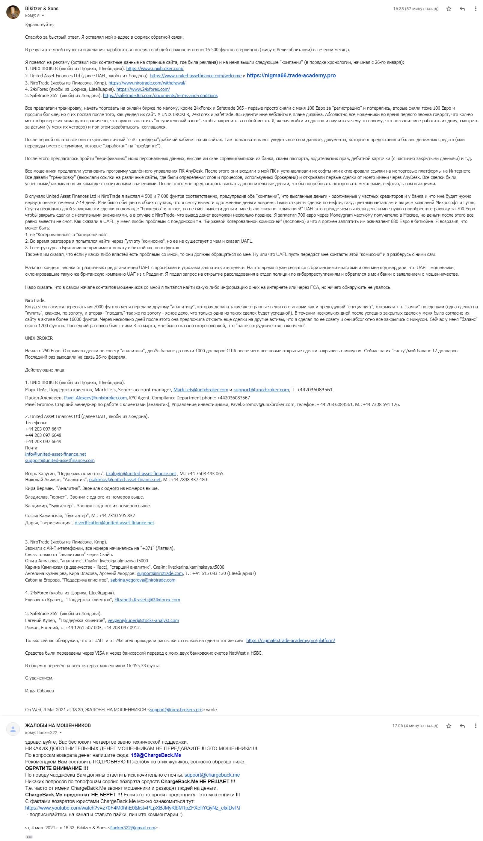 Молодой человек написал подробную жалобу на контору 24 Х Форекс, а также на ее соучастников, которые отобрали у него 16 500 фунтов стерлингов и не возвращают.