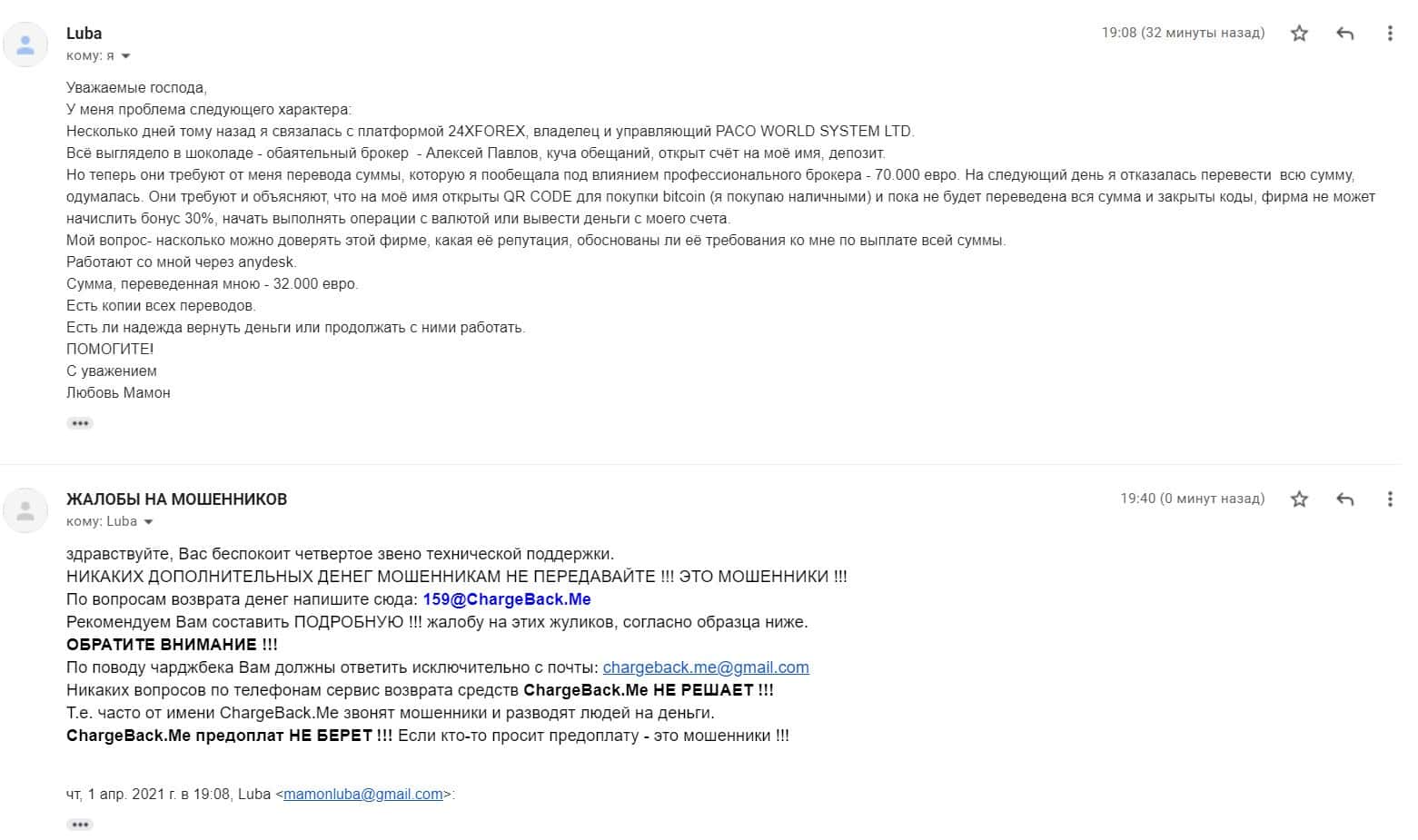 Далее предлагаем ознакомиться с жалобой о том, что лохотронщики 24XForex кинули очередную пострадавшую клиентку от деятельности данной конторы на 32 000 евро.