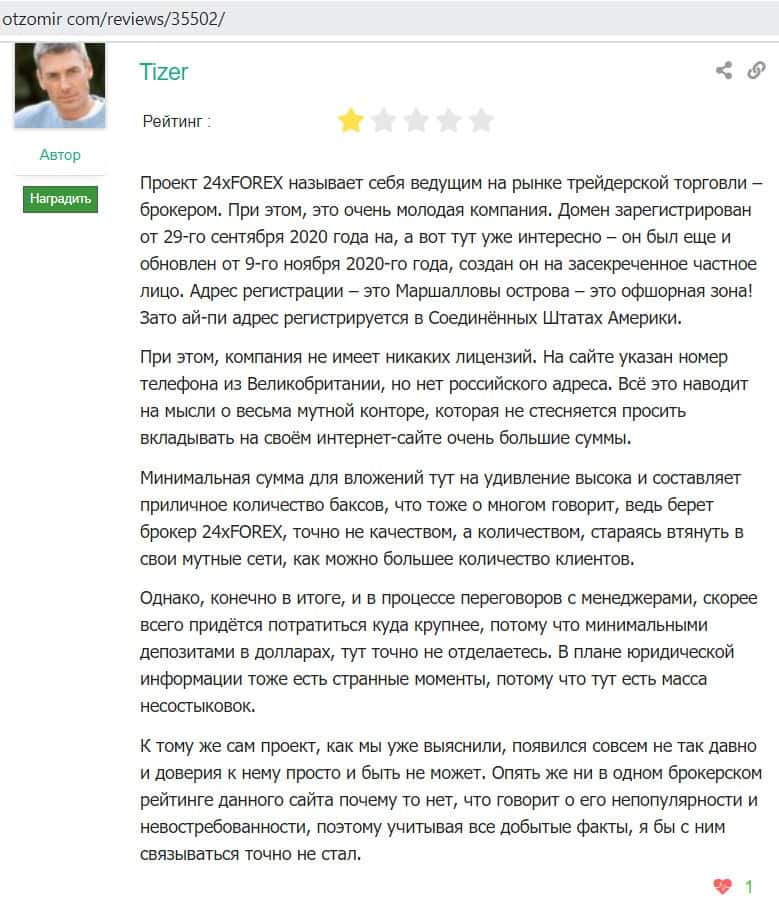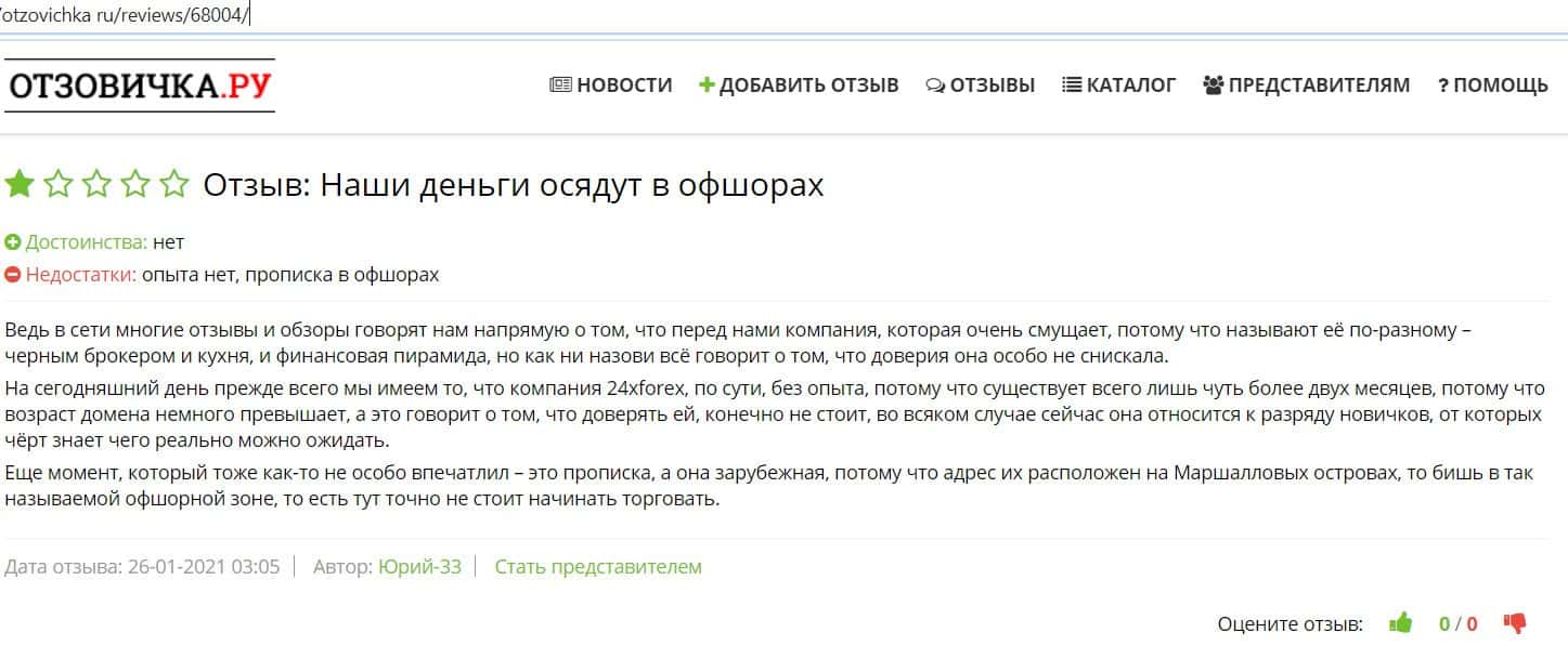 В отзыве на сайте Отзовичка пишется, что компанию 24XForex лучше назвать кухней или же черным брокером, так как по всему видно, что это фальшивка-однодневка.