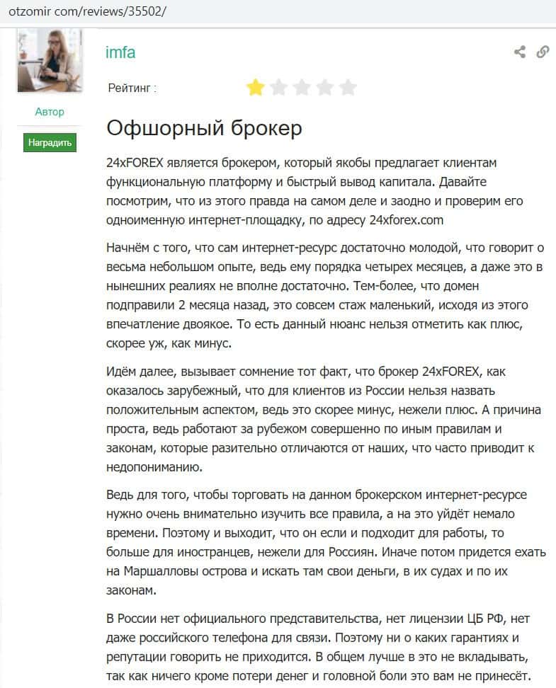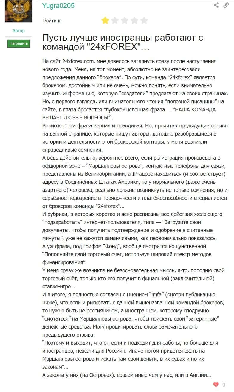 Девушка пишет, что тот факт, что контора 24XForex является зарубежное, скорее минус, чем плюс, так как очень сложно отсудить потерянные по вине таких брокеров средства.