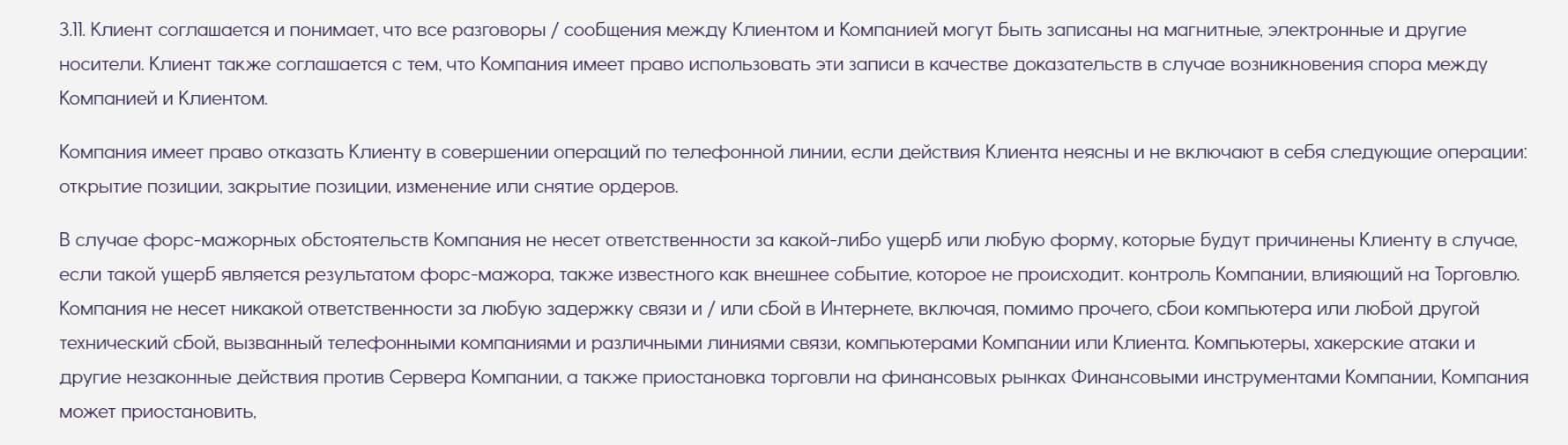 Пункт 3.11 говорит о том, что компания будет записывать все переговоры с пользователем, а также, она не виновата в убытках клиента в случае задержек связи и плохого сигнала.