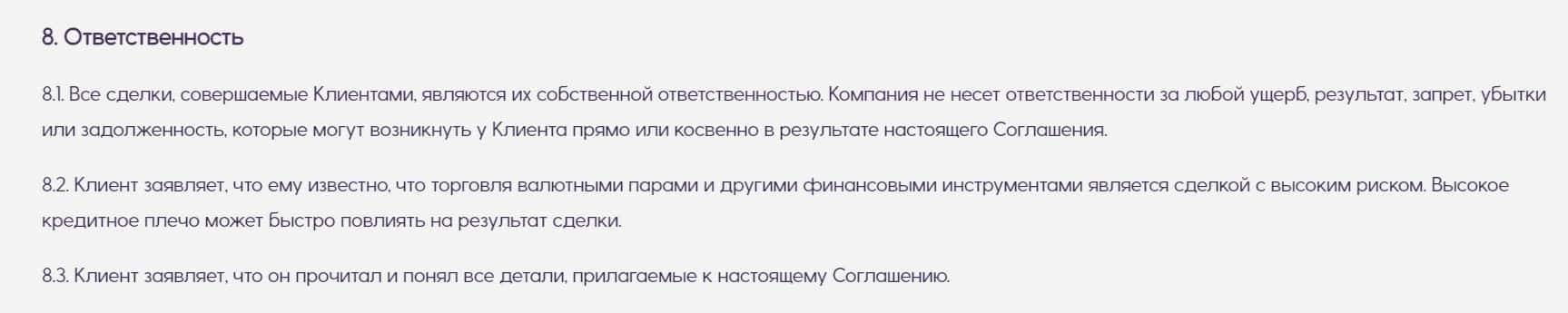 В восьмом разделе своего соглашения, аферисты 24 Х Форекс еще раз подтверждают, что во всех бедах всегда будет виноват только клиент, и заставляют его подписаться под этим.