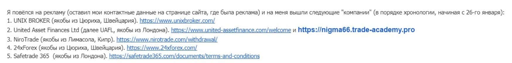 Шарашка 24XForex непосредственно связана с еще четырьмя недоброкерами, использующими те же методы: UnixBroker, Юнайтед Ассет Финанс, NiroTrade, Сейф Трейд 365.