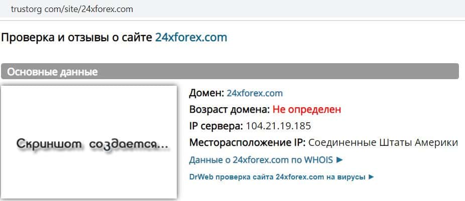 Сервис проверки доменов Трасторг не смог определить возраст сайта 24xforex com, так как лохотронщики, создавшие его, намеренно засекретили всю информацию.