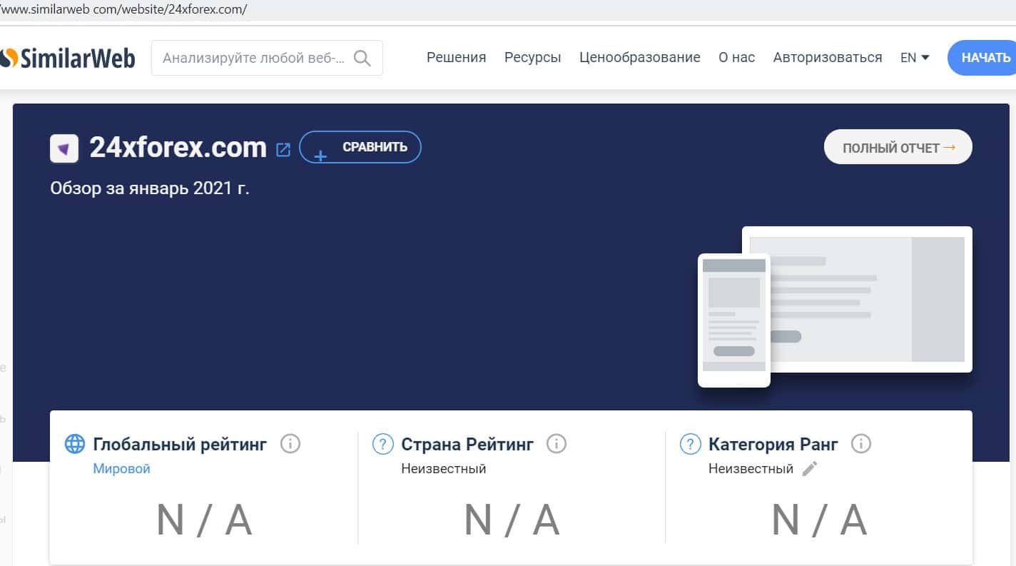 Сайт проверки трафика компаний Симиларвеб выдал такую информацию по домену 24xforex com: ресурс в базе не обнаружен. Это говорит о том, что он фальшивый.