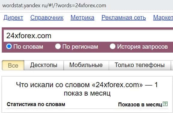 В поисковой системе Яндекс сайт брокерской конторы "24xforex.com", вбитый в строку с точкой, пользователи искали 1 раз за месяц.