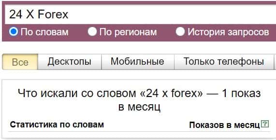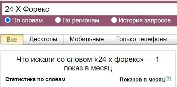 Посмотрим, сколько раз люди искали название бренда "24 Х Форекс" на русском языке с пробелом: 1 показ.