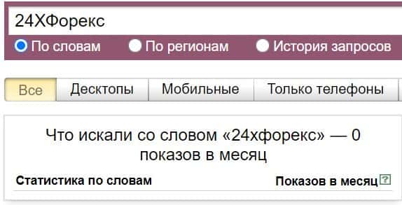 Название бренда на русском языке без пробела "24ХФорекс", пользователи совсем не искали в системе Яндекс.
