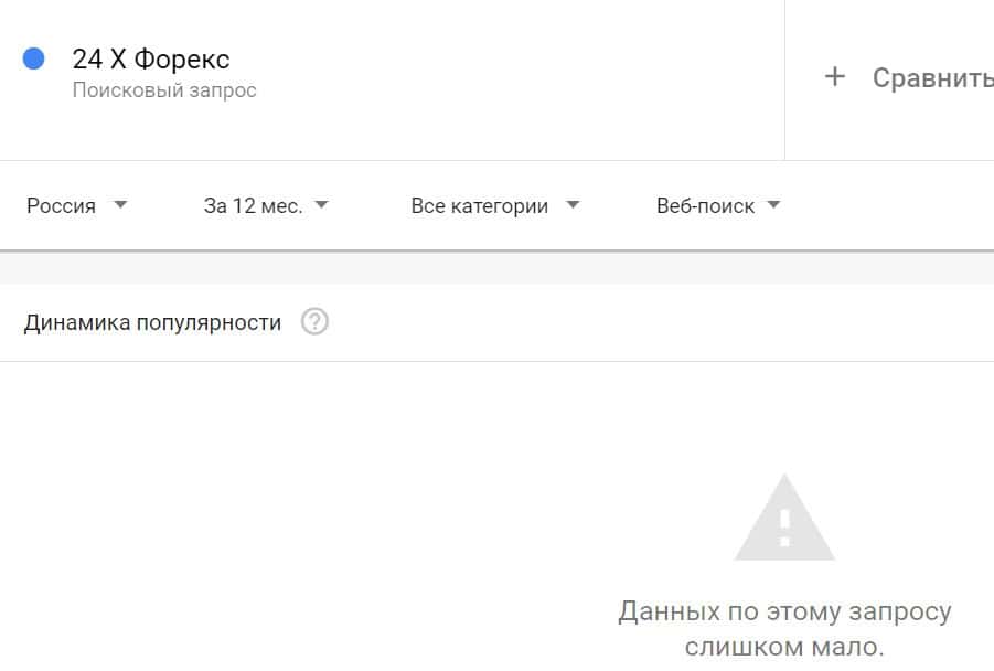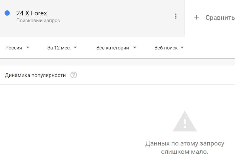 Если вбить то же название на английском языке, но с пробелом - "24 X Forex", результат поиска будет таким: очень мало данных.