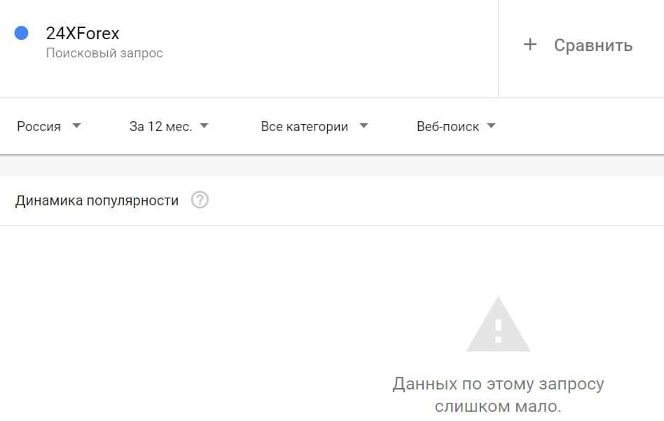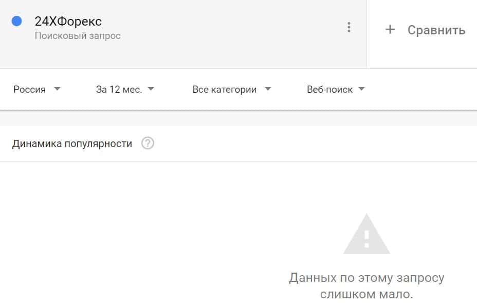 Посмотрим, насколько популярно название бренда "24XForex", написанное на английском языке. Данных по этому запросу нет, так как никто не искал этот бренд в Гугл.
