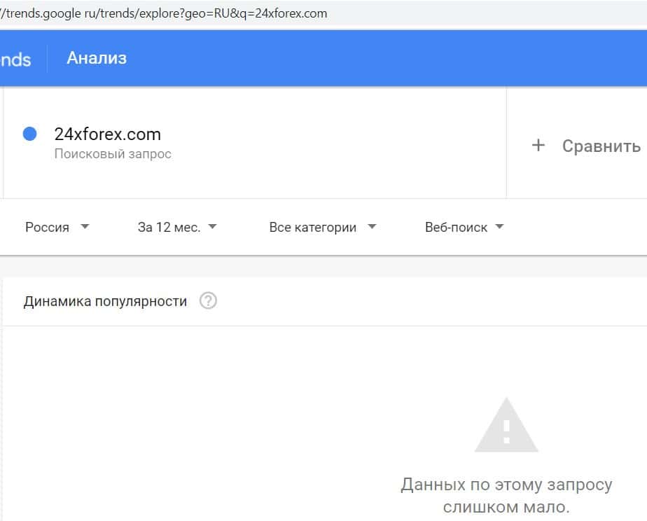 Доменное имя мошеннического сайта "24xforex.com" пользователи вбивали в поисковую систему Гугл слишком редко, поэтому данных по этому запросу очень мало.