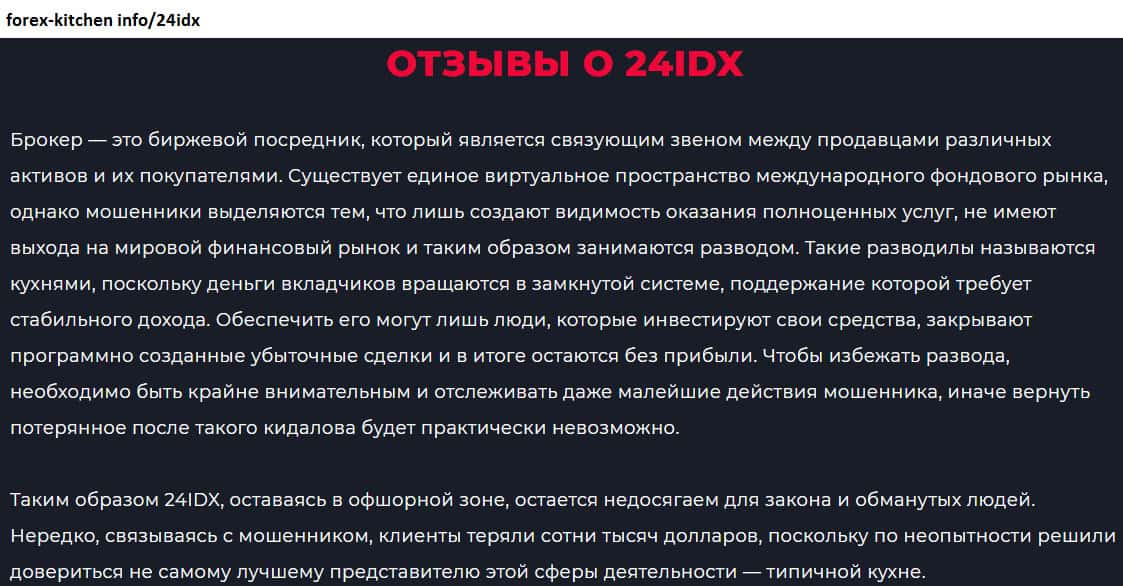 На самом деле детальный обзор сайт 24IDX и не требует. Все довольно просто и даже примитивно. Создание такое ресурса не требует больших финансовых вложений и делается максимум за пару дней. Мошенники предлагают минимальный набор инструментов. Информативность сайта тоже, мягко говоря, слабая. Вывод один: контора жуликов создала сайт-однодневку и особо не парится.
