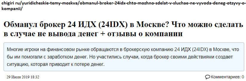 В связи с тем, что лохотрон 24 ИДХ действующий, мошенники всячески зачищают негативные о себе комментарии в сети. Платформа работает уже около двух лет и логично, что должны быть отзывы трейдеров о работе 24IDX. Неужели за такой период времени никто так и не решился что-нибудь написать? Сомневаюсь! Лоховоды тщательно шерстят в сети комменты и свои разоблачения моментально удаляют.