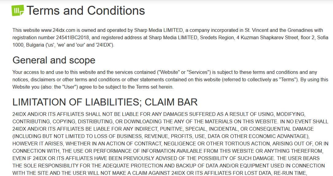 Клиентское соглашение у шаражки 24IDX есть, но оно вам не дает вообще никаких гарантий того, что ваши права как-то будут соблюдаться и вообще на него можно опереться. Обыкновенная лакмусовая бумажка, которая не имеет никакой юридической силы. Не стоит на это рассчитывать. Предъявить в суде вы его не сможете.