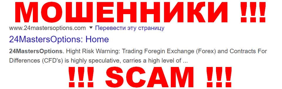 24MastersOptions – мошенническая организация. Данная англоязычная платформа предлагает своим клиентам по всему миру заработать посредством трейдинга на Форекс и бинарных опционах. На деле же 24 Мастерс Опционс – очередные мошенники, которым нужны лишь ваши деньги. Не связывайтесь с шулерами 24MastersOptions!