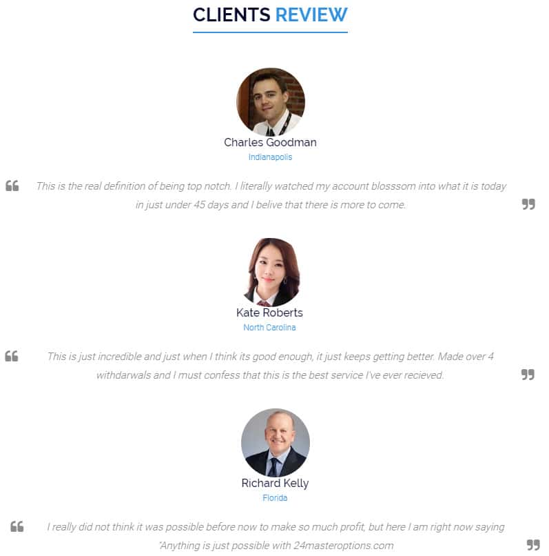 Одним из инструментов пропаганды, использовавшиеся шулерами 24MastersOptions, являются проплаченные отзывы. Они публикуются как на сторонних веб-порталах, так и на самом сайте 24 Мастерс Опционс. Предлагаем вам взглянуть на эти самые отзывы от якобы реальных и успешных жителей США, заработавших вместе с 24MastersOptions.