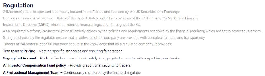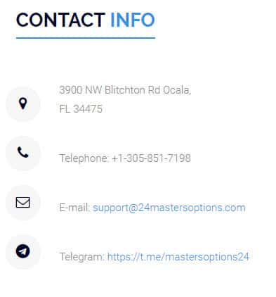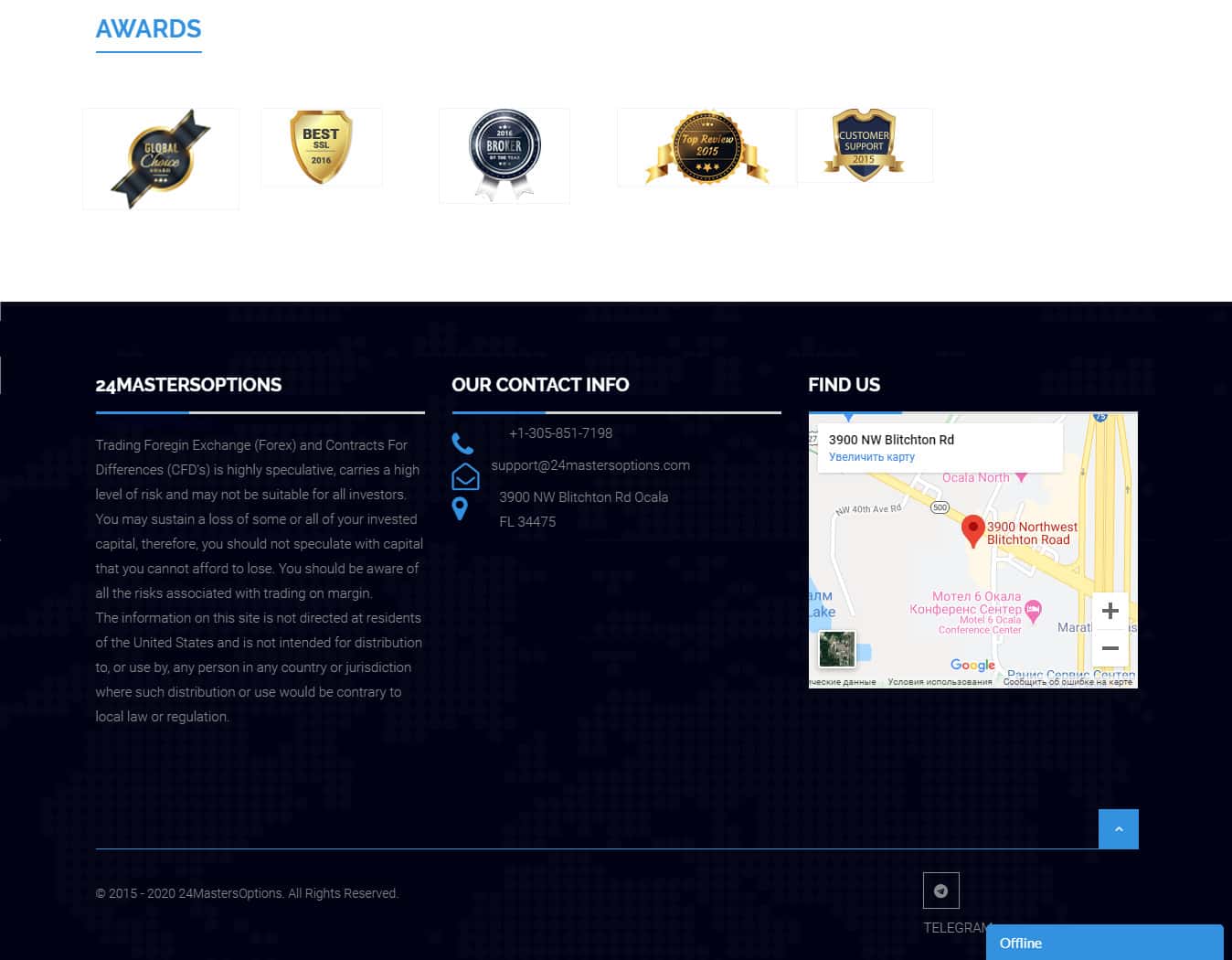 На своём веб-ресурсе кидалы 24MastersOptions позиционируют себя как уважаемую контору со штаб-квартирой во Флориде, США. Стоит ли говорить, что на своём сайте кидалы моги написать любую лабуду, не имеющую к реальности никакого отношения. На самом деле, всё это и оказалось лабудой, написанной для повышения доверия к данному лохотрону.