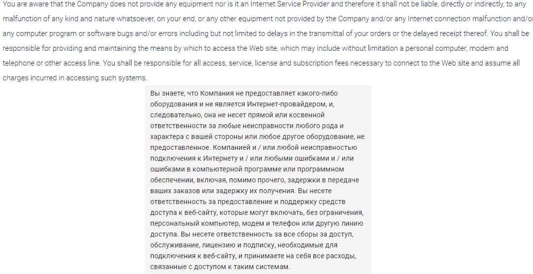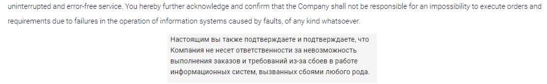 Также договор аферистов 24MastersOptions включает в себя большое количество лазеек, позволяющих мошенникам безнаказанно воровать деньги своих вкладчиков. Для этого они оставляют в своём договоре такие небольшие нюансы, как, например, если с вашим ордером что-то произойдёт и вы потеряете деньги, мы за это не отвечаем. Никоим образом.