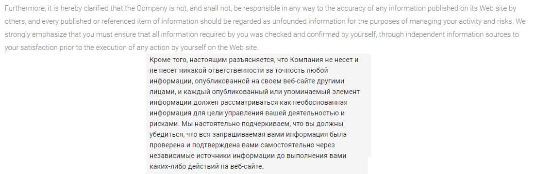 Если взглянуть на договор, то тут же можно распознать истинную мошенническую суть шулеров 24 Мастерс Опционс. В своём договоре кидалы напрямую заявляют то, что их сайт содержит неправдивую информацию и то, что мошенники никоим образом не отвечают за это.