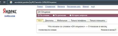 В поисковой системе Яндекс, мошенники под брендом "24 Опционс" не очень популярны и не набрали ни одного запроса за месяц.