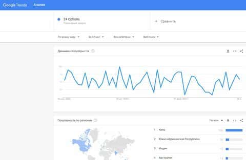 По поводу англоязычной версии бренда "24 Options" контора вошла в поиск системы Гугл несколько раз за месяц и все запросы шли из Кипра, ЮАР, Индии и Австралии.