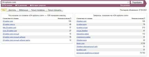 Ну и конечно же бренд "24-options.com" по версии Яндекс.Вордстат набрал 106 показов, что показывает их некую популярность в интернете.