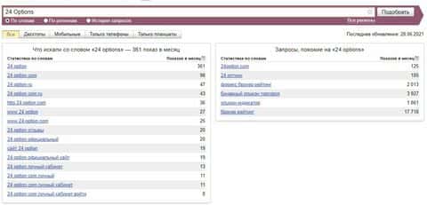 Показатели по бренду лохотрона "24 Options" немного другие и насчитывают 361 показ за месяц. Мошенники по такому запросу немного популярны в поисковой системе Яндекс.
