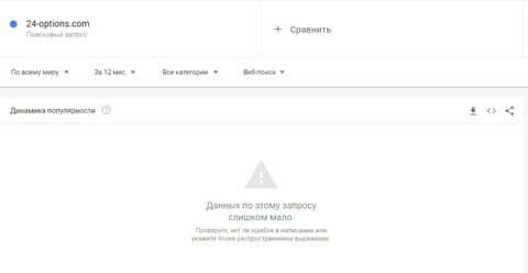 Та же ситуация и с брендом самого сайта "24-options.com" где такие же показатели. Контора 24 Опционс не популярна, так как является очередной шарагой-однодневкой.